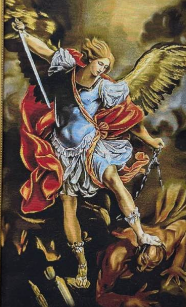 - Representación artística de San Miguel Arcángel en actitud de defensa y justicia divina.